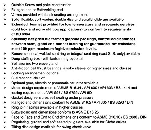 Manufactured to BS-5352 Tested to BS-5146 Outside and bonnet made from high quality forgings Body and bonnet made from high quality forgings. Taper Plug type disc and shoulder seated screwed seat ring with perfect matching of mating parts to assure leak tightness. Easy access to stuffing box. Self aligning gland and follower. Streamlined flow passages to minimise pressure losses and erosion. Back sealing surfaces provided integral to bonnet.